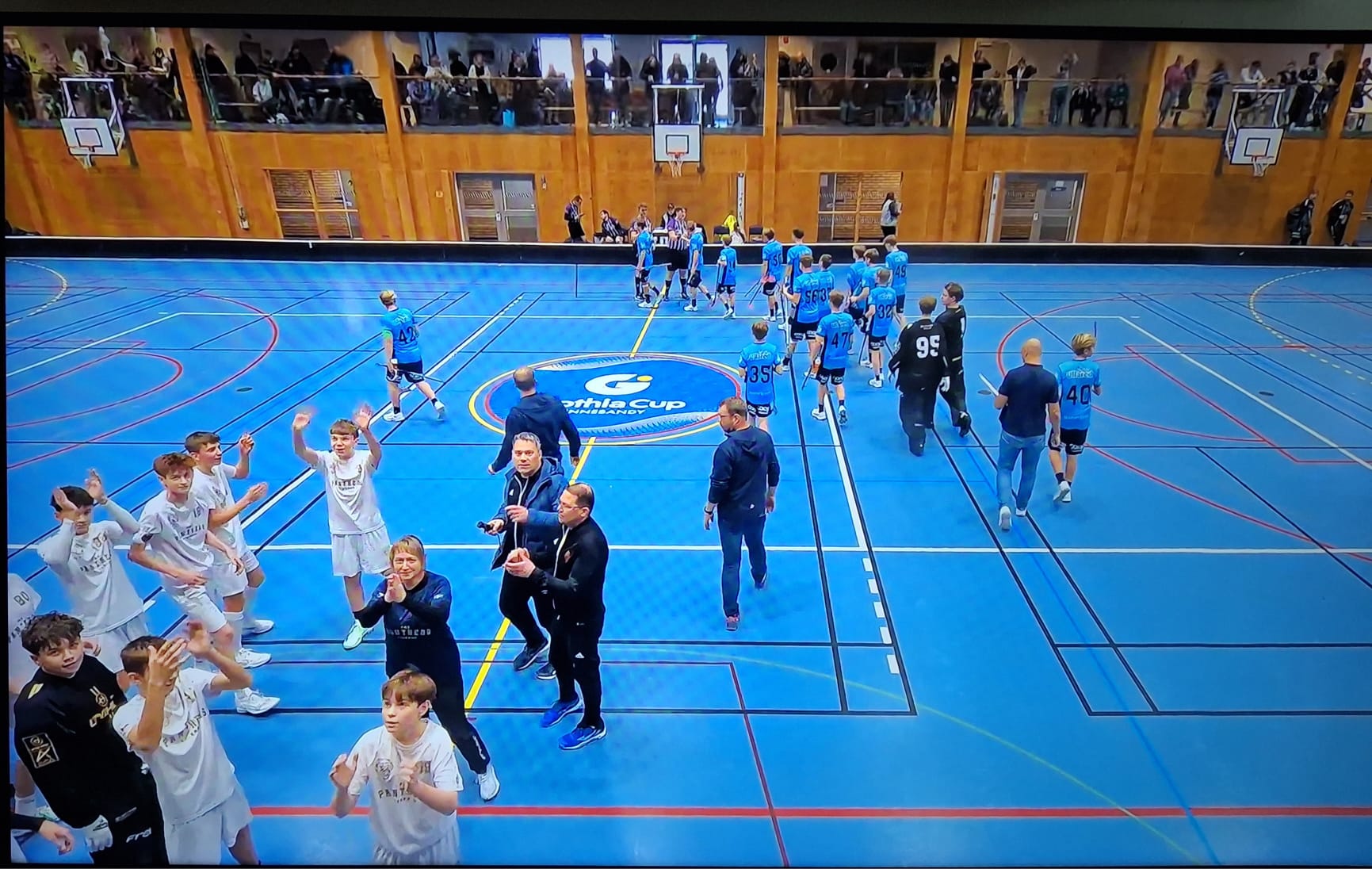 V prvním kole vyřazovací části jsme čelili jednomu z favoritů turnaje a suverénnímu leaderovi své základní skupiny, domácímu výběru Pixbo. Sebevědomí švédští hráči dávali od počátku najevo, že berou jedině výhru. Tlačili se více do tvoření hry, ale náš soustředěný a kvalitní herní projev eliminoval jejich plánovanou dominanci. Soupeř se dostal do dvoubrankového vedení. Nám se sice podařilo snížit, ale ten se opět se dostal na distanci 2 gólů. Naději vykřesal náš gól na 2:3 a 3 minuty před koncem základní hrací doby jsme vyrovnali. O vítězi měla rozhodnout série 5-ti samostatných nájezdů. Do branky jsme poslali do té doby náhradního brankáře Vítka Zajíčka a chtěli tímto tahem soupeře překvapit a při 100%-ní efektivitě při zakončení v prvních třech sériích z naší strany a stejného poměru úspěšných zákroků našeho brankáře se nám to podařilo. Domácí sice sérii zdramatizovali, ale poslední nájezd se nám vydařil a mohla propuknout euforie z nečekaného postupu.